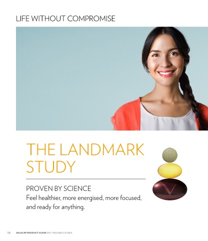 LIFE WITHOUT COMPROMISE THE LANDMARK STUDY PROVEN BY SCIENCE Feel healthier, more energised, more focused, and ready for anything. 16 SHAKLEE PRODUCT GUIDE LIVE YOUNGER LONGER