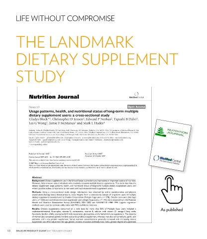 LIFE WITHOUT COMPROMISE THE LANDMARK DIETARY SUPPLEMENT STUDY As published 18 SHAKLEE PRODUCT GUIDE LIVE YOUNGER LONGER