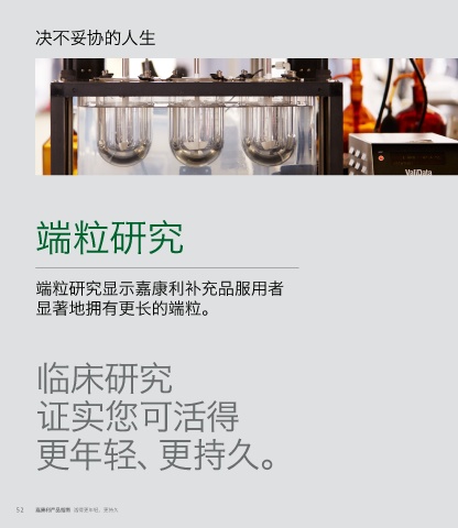 决不妥协的人生 端粒研究 端粒研究显示嘉康利补充品服用者 显著地拥有更长的端粒。 临床研究 证实您可活得 更年轻、更持久。 52 嘉康利产品指南 活得更年轻、更持久