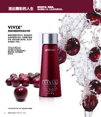 活出精彩的人生 感觉更年轻, 更健康。 活出精彩人生,让生活充满生机。 VIVIX® 美味的植物萃取混合饮料 美味的植物萃取饮料,富含嘉康利 独家的植物性混合,包括麝香葡萄 萃取、欧洲接骨木果萃取、虎杖萃 取和紫萝卜萃取。* #10320| 150 毫升/ 30 份 建议用量: 食用前请摇匀。 每日1茶匙,加入您喜爱的饮料中, 搅拌后饮用。冷饮口感更佳。 保持冷藏。 *这些产品非用于诊断、治疗、治愈或预防任何疾病。 54 嘉康利产品指南 活得更年轻、更持久